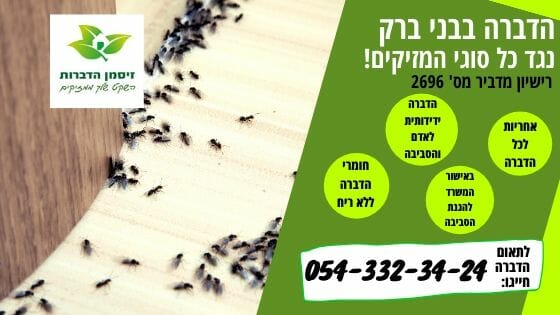 חברת זיסמן הדברות פועלת שנים רבות בתחום ההדברה בבני ברק והסביבה. מחפשים הדברה ירוקה בבני ברק? אנו מתמחים בהדברה ירוקה ומספקים שרותי ריסוס והדברה בכל בני ברק והסביבה. הדברה ירוקה נגד נמלים ותיקן גרמני באמצעות ג'ל פיתיון ידידותי וללא רעלים. ג'ל הפיתיון נחשב להדברה ירוקה שאינו מכיל בתוכו רעלים כימיים. הדברה ירוקה בבני ברק באמצעות ג'ל פיתיון יעיל ואפקטיבי לזמן ממושך ואינו מצריך יציאה מהבית לאחר ההדברה.